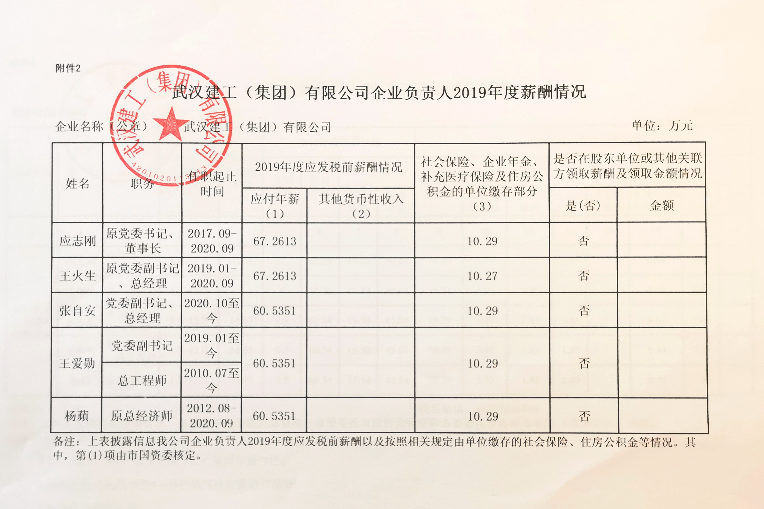 武漢建工(集團)有限公司企業(yè)負(fù)責(zé)人2019年度薪酬情況